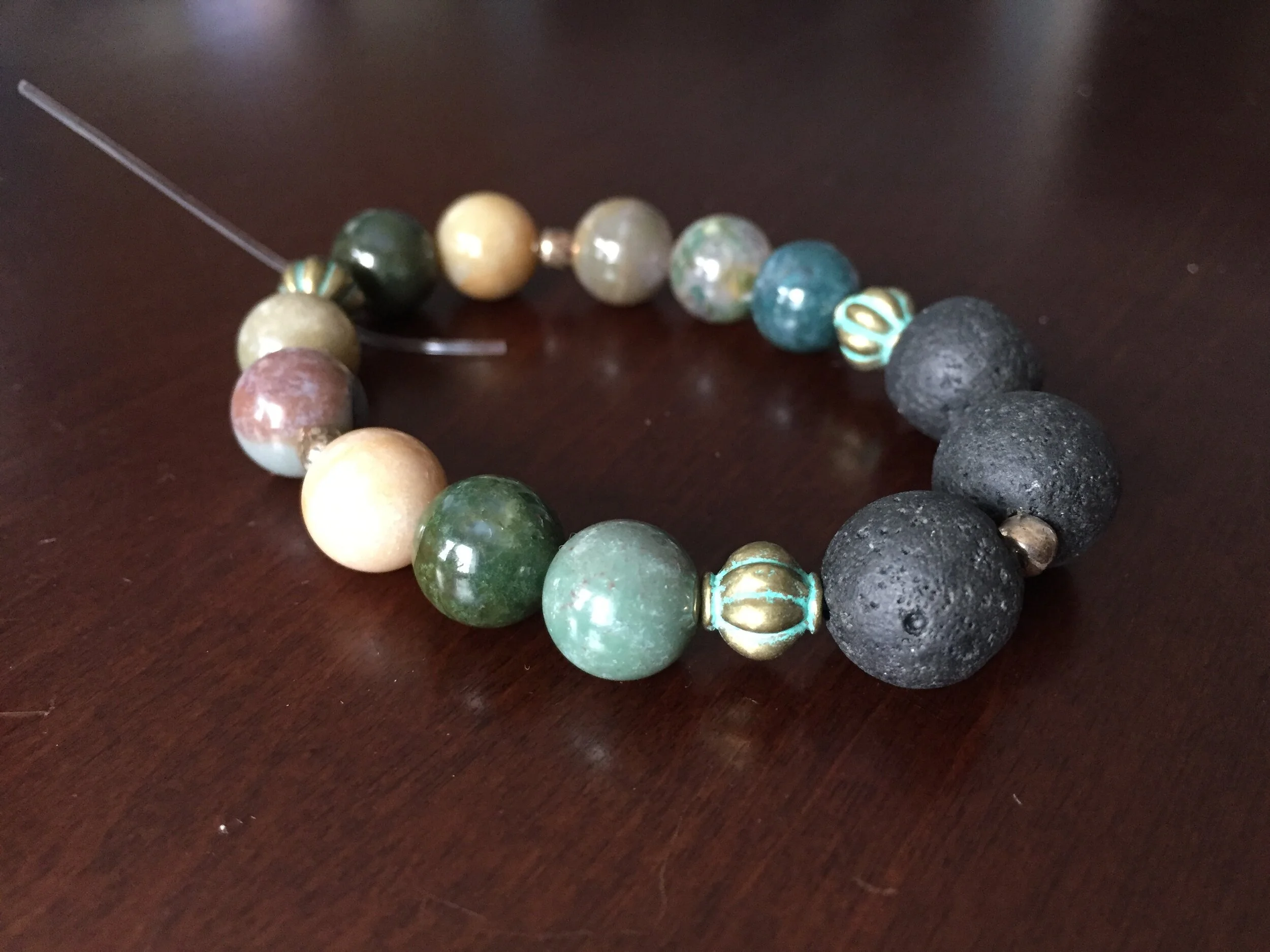 Place bracelet on a paper towel or small plate. Add 2-3 drops of your favorite essential oil or blend to each of the porous, black lava beads. Let it sit for a few minutes until it soaks into the stone.